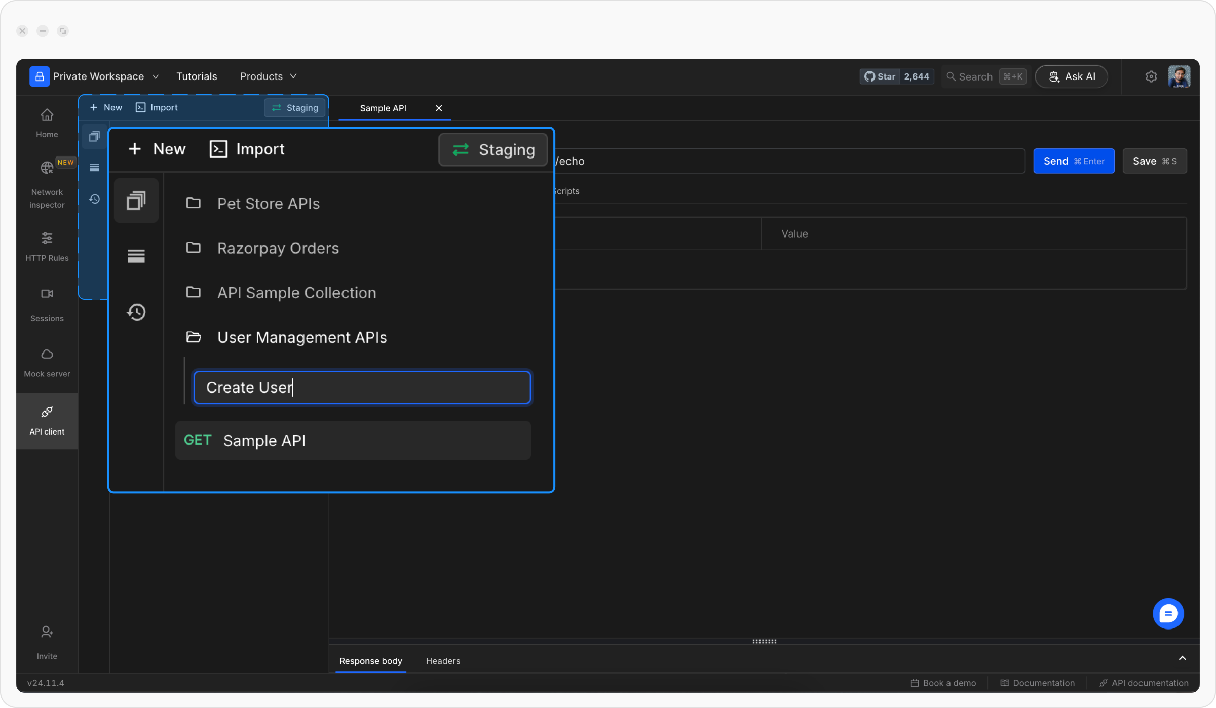 Importbutton allows you to import APIs from cURL, Requestly Collections, or Postman Collections. - Next to the Import button is the Environment Switcher, which lets you switch between environments.