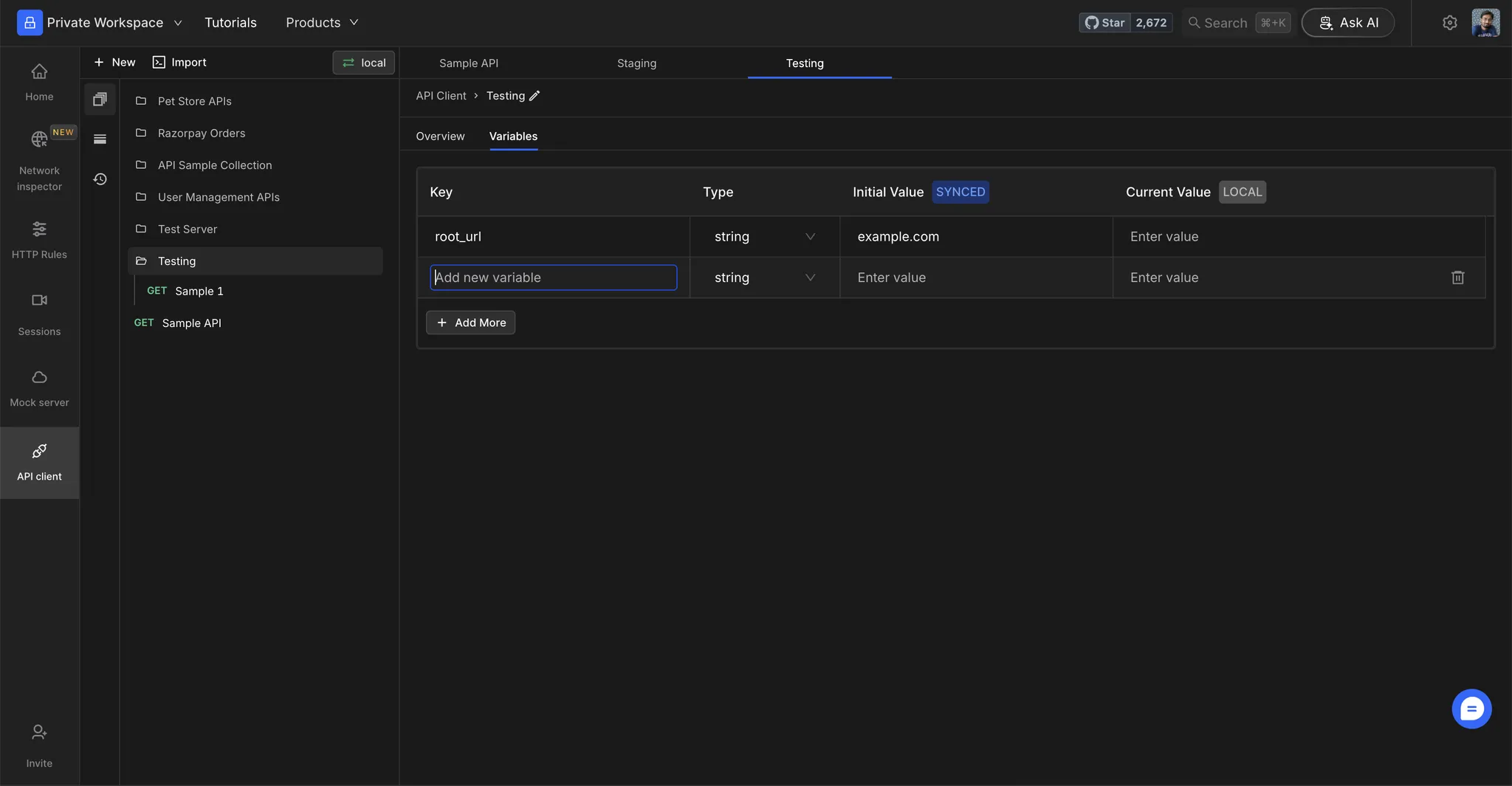 Current value (local): Current values are user-defined entries that are not synced across the workspace. These values will override the defined Initial values. If the current value is empty or left blank, then the initial value of the variable will be used.