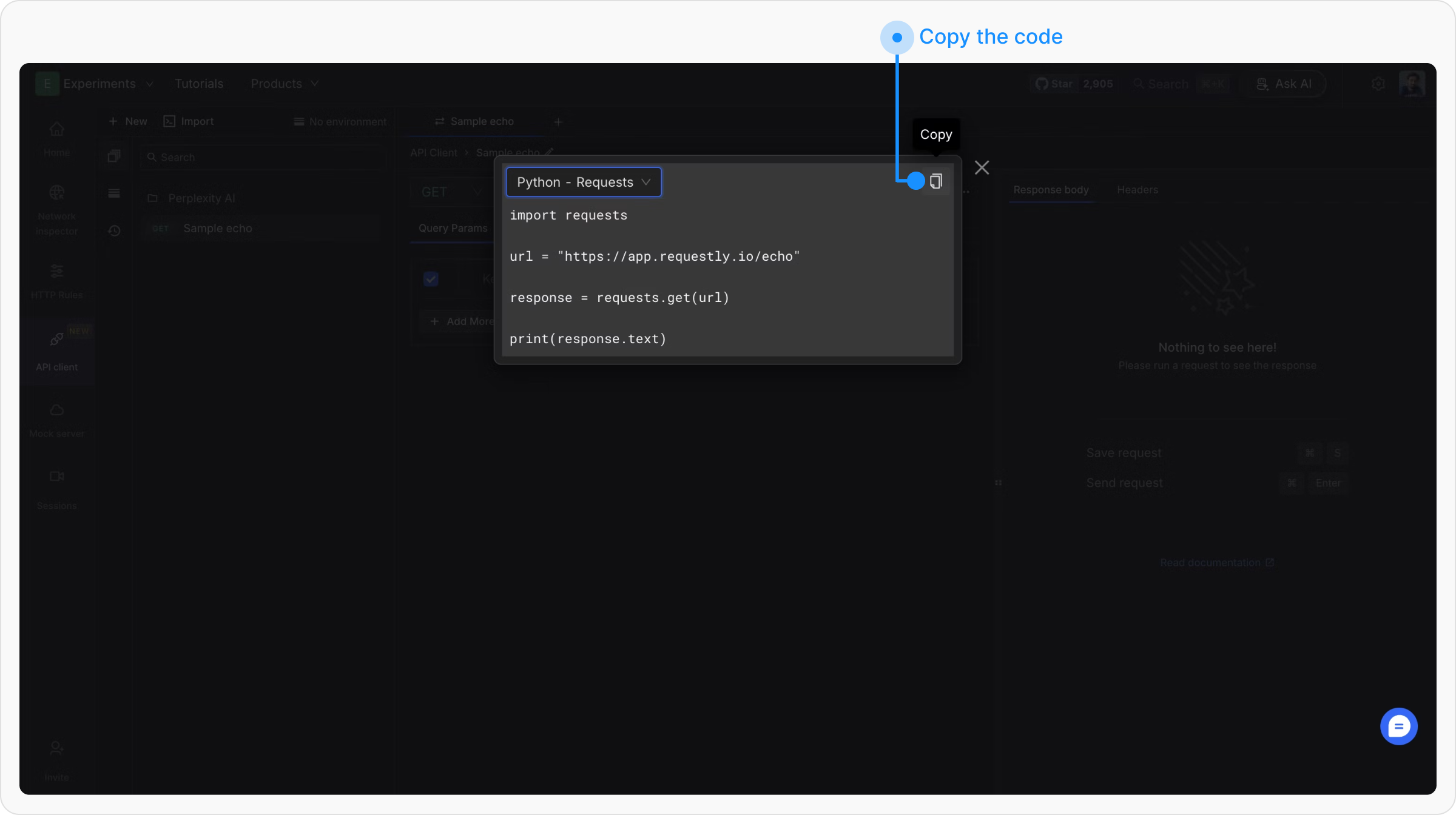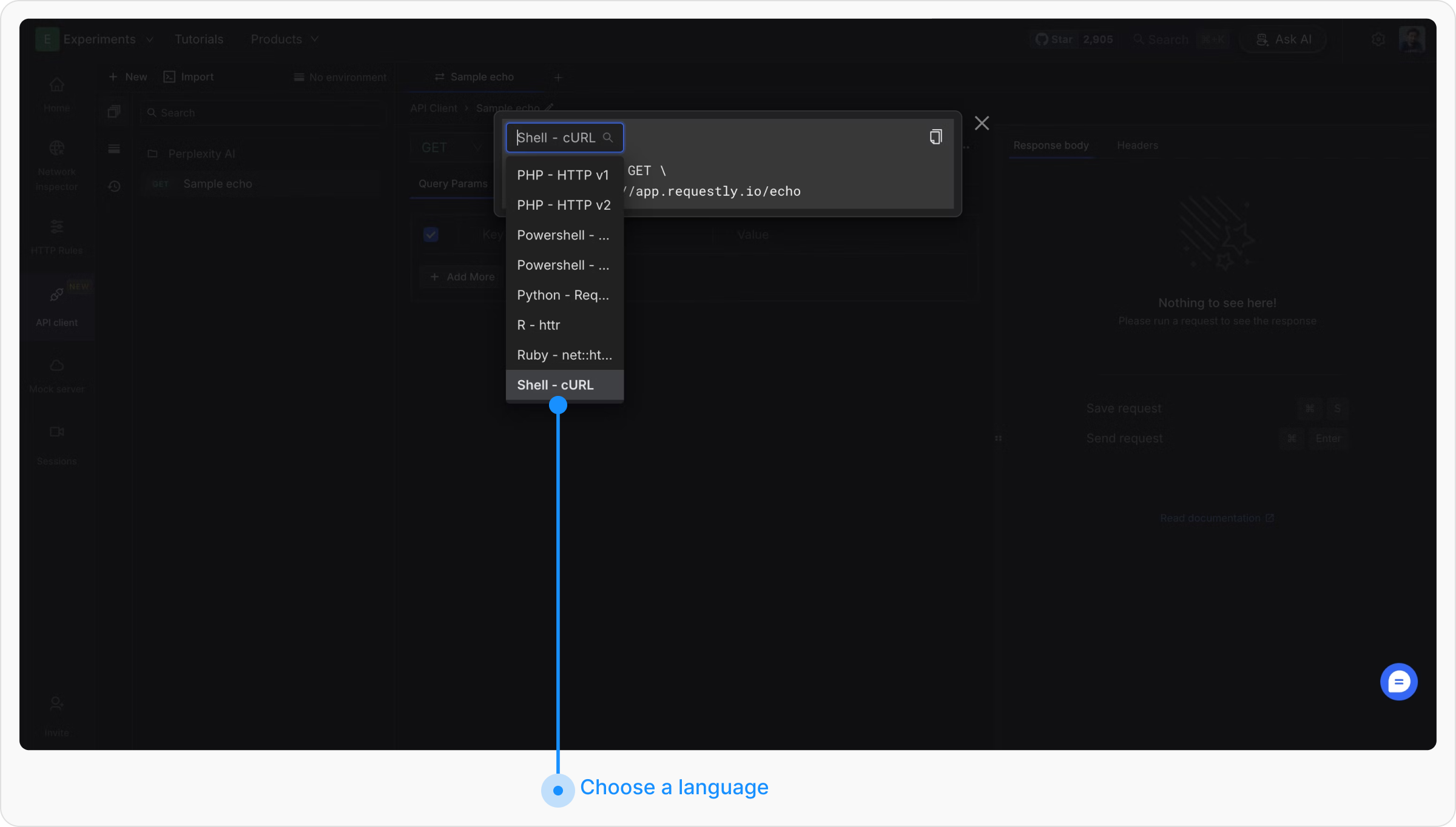 A modal will open displaying the client code for the selected programming language. You can switch between languages using the dropdown at the top left of the modal.