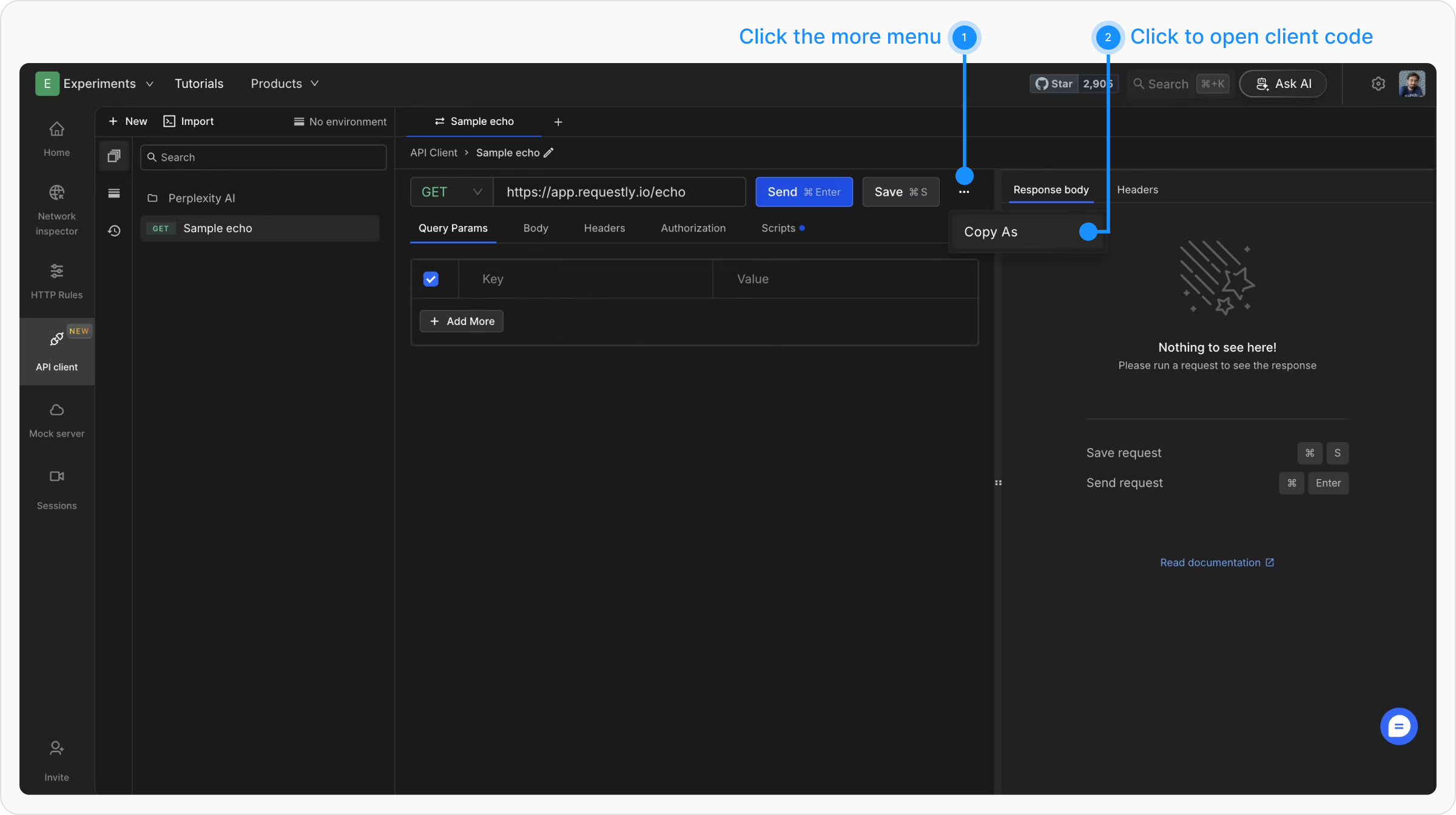 Follow these steps to generate client code for your API request:Access Code Generation Menu
