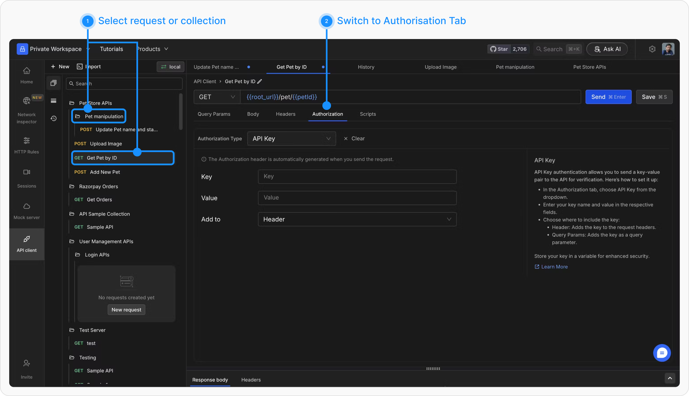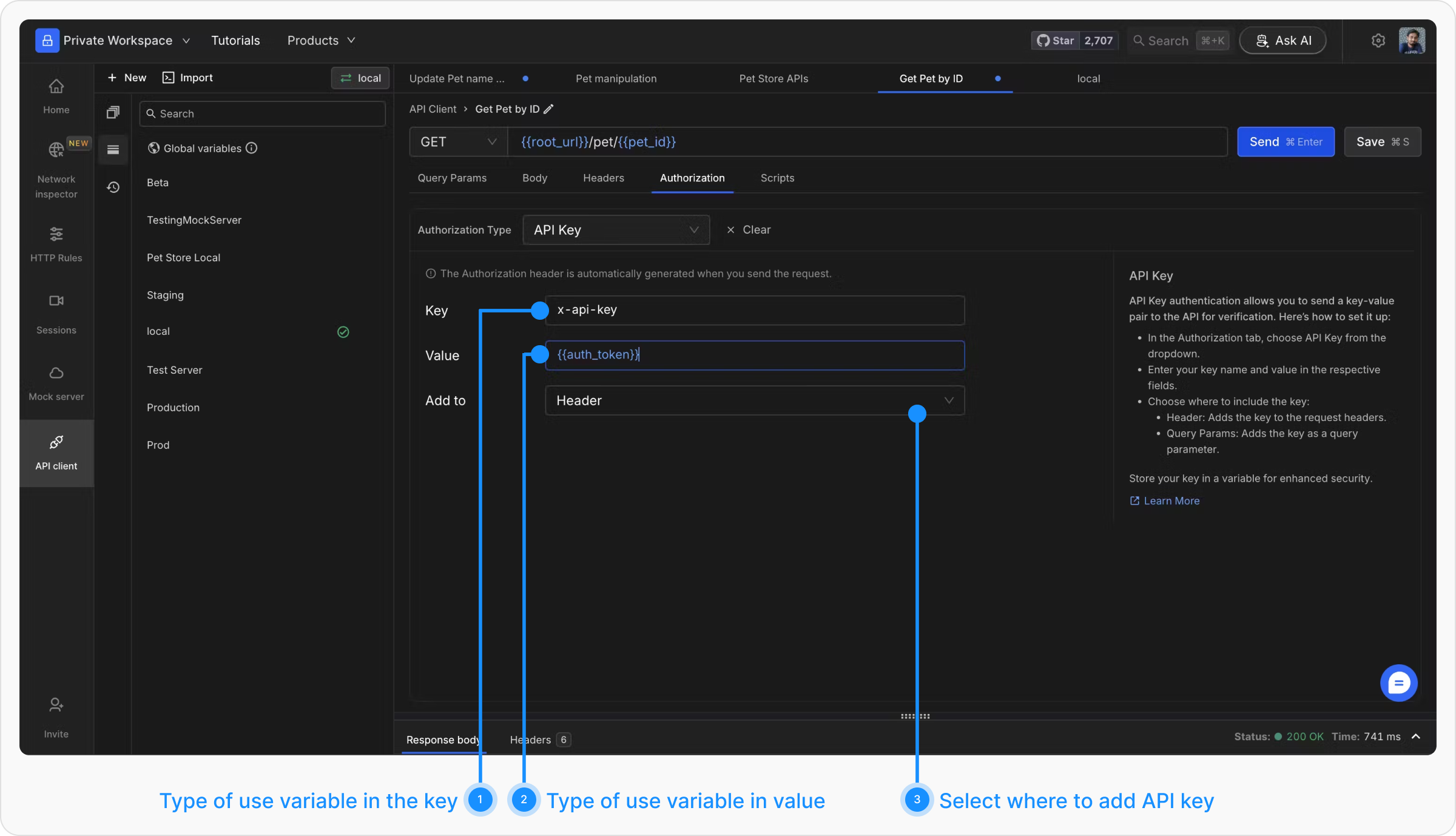Requestly allows you to send key-value pairs along with the request data. These can be added to either Headers or Query Params. Select “API Key” from the Auth Type list, then enter your key name and value. Choose “Header” or “Query Params” from the “Add to” dropdown list for their inclusion. Variable storage enhances security.
