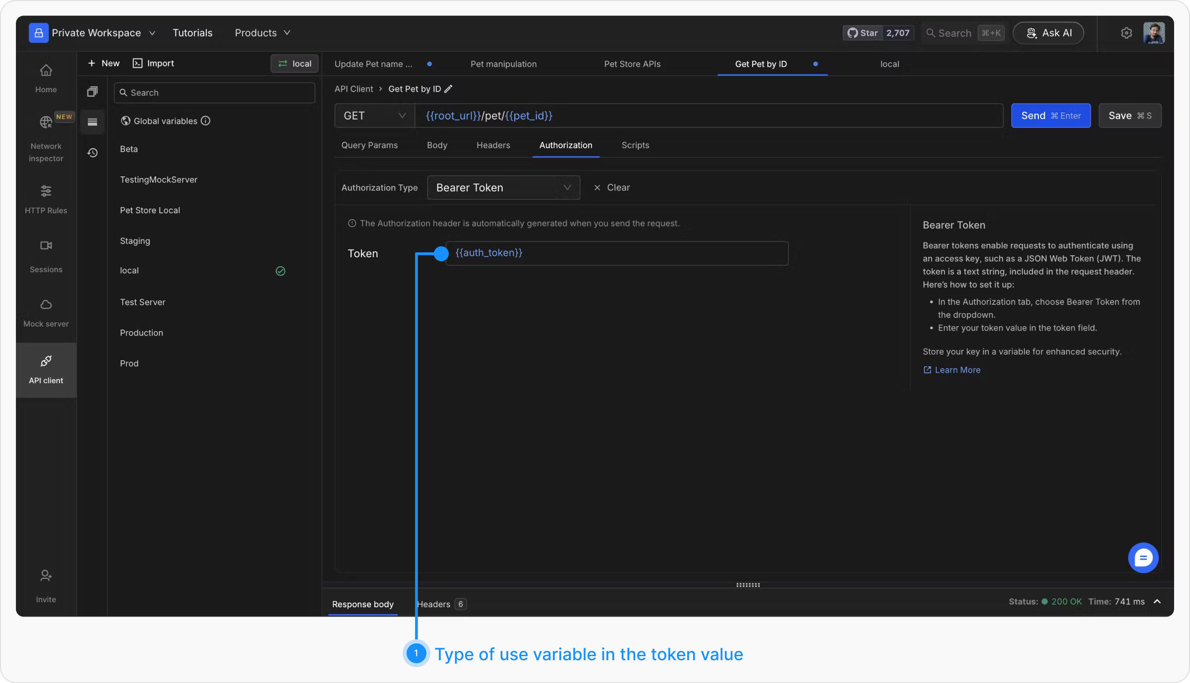 Bearer tokens enable requests to authenticate using an access key such as a JSON Web Token (JWT). Tokens are included in the request header. Select “Bearer Token” from the Auth Type dropdown and enter the token value. For additional security, store the token in a variable and reference it by name.