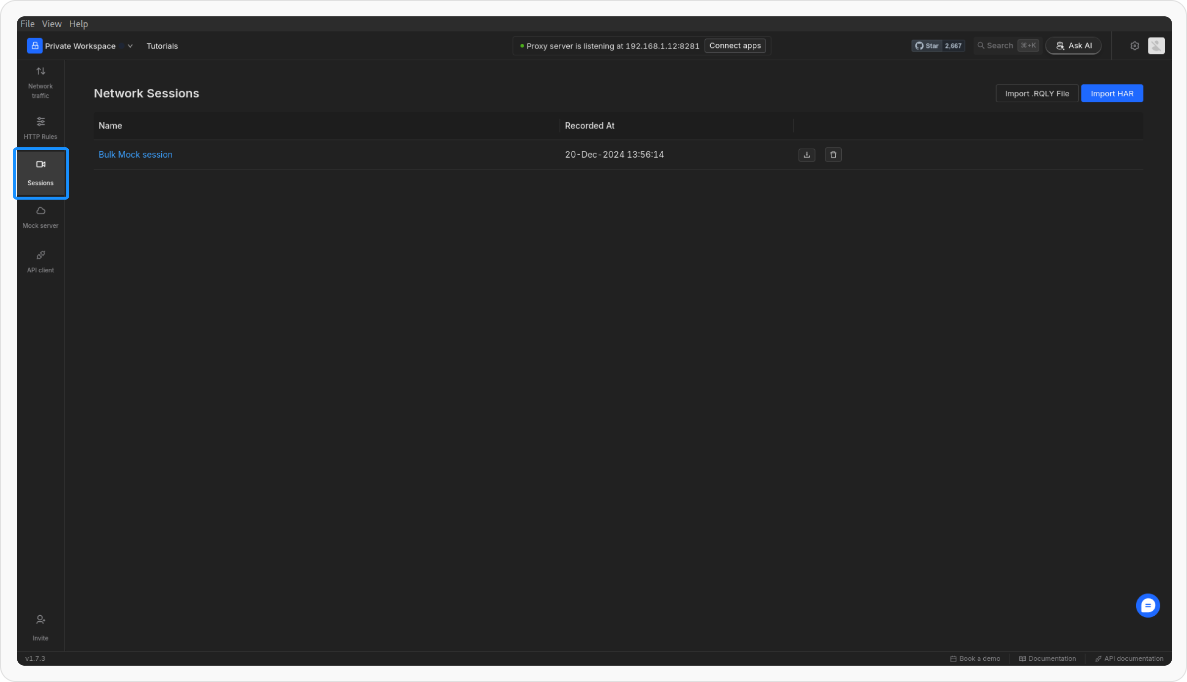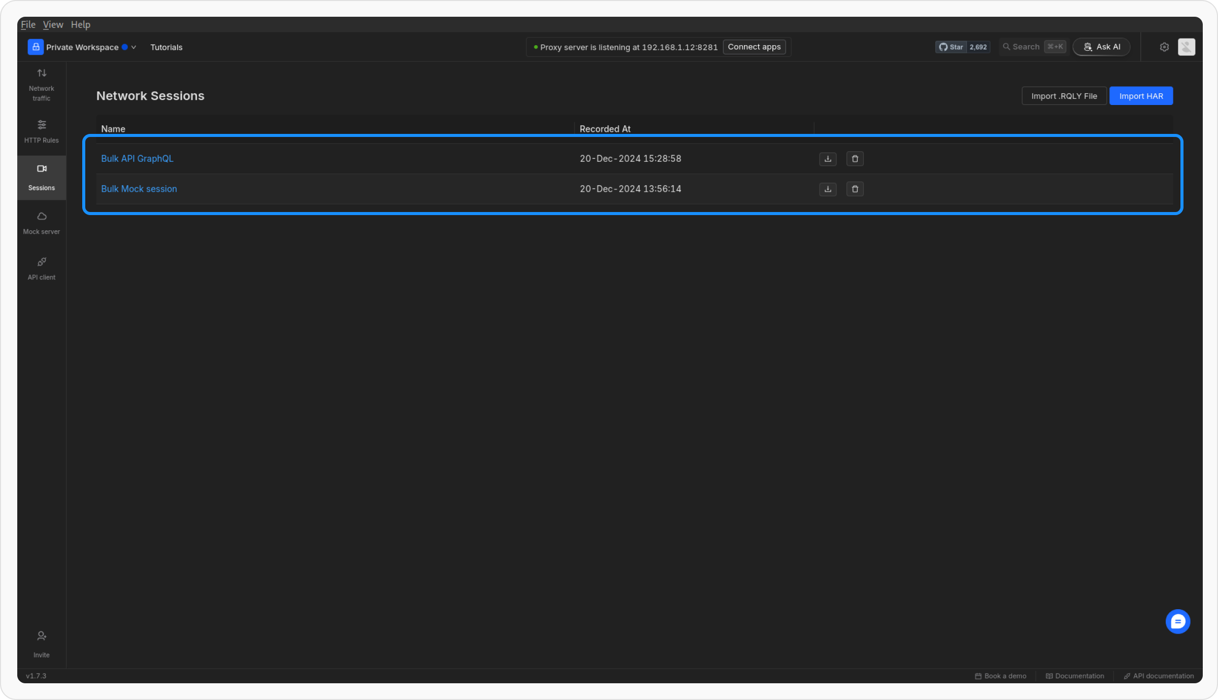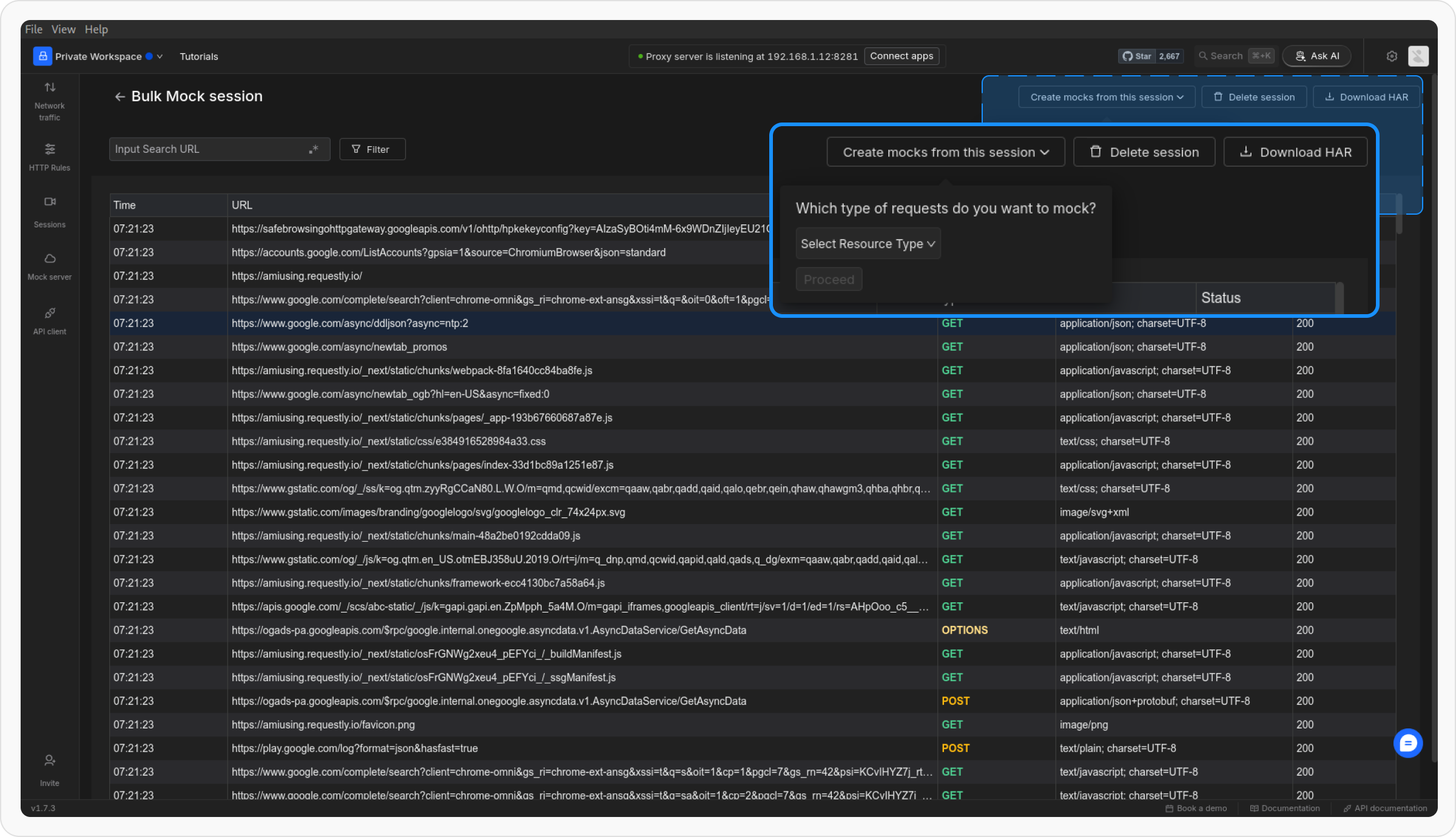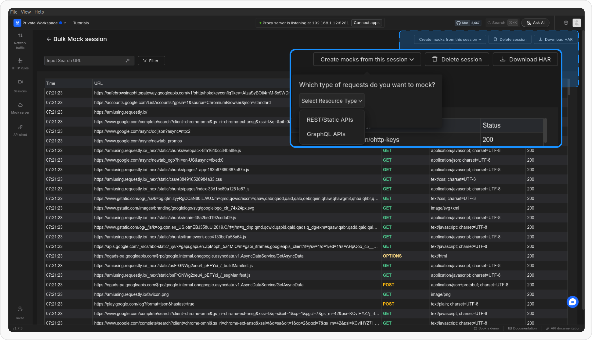Once you’ve recorded an API session, you can easily generate bulk mock rules based on the captured requests. This is a quick way to mock multiple API endpoints without manually configuring each one.Select the Session for Mocks