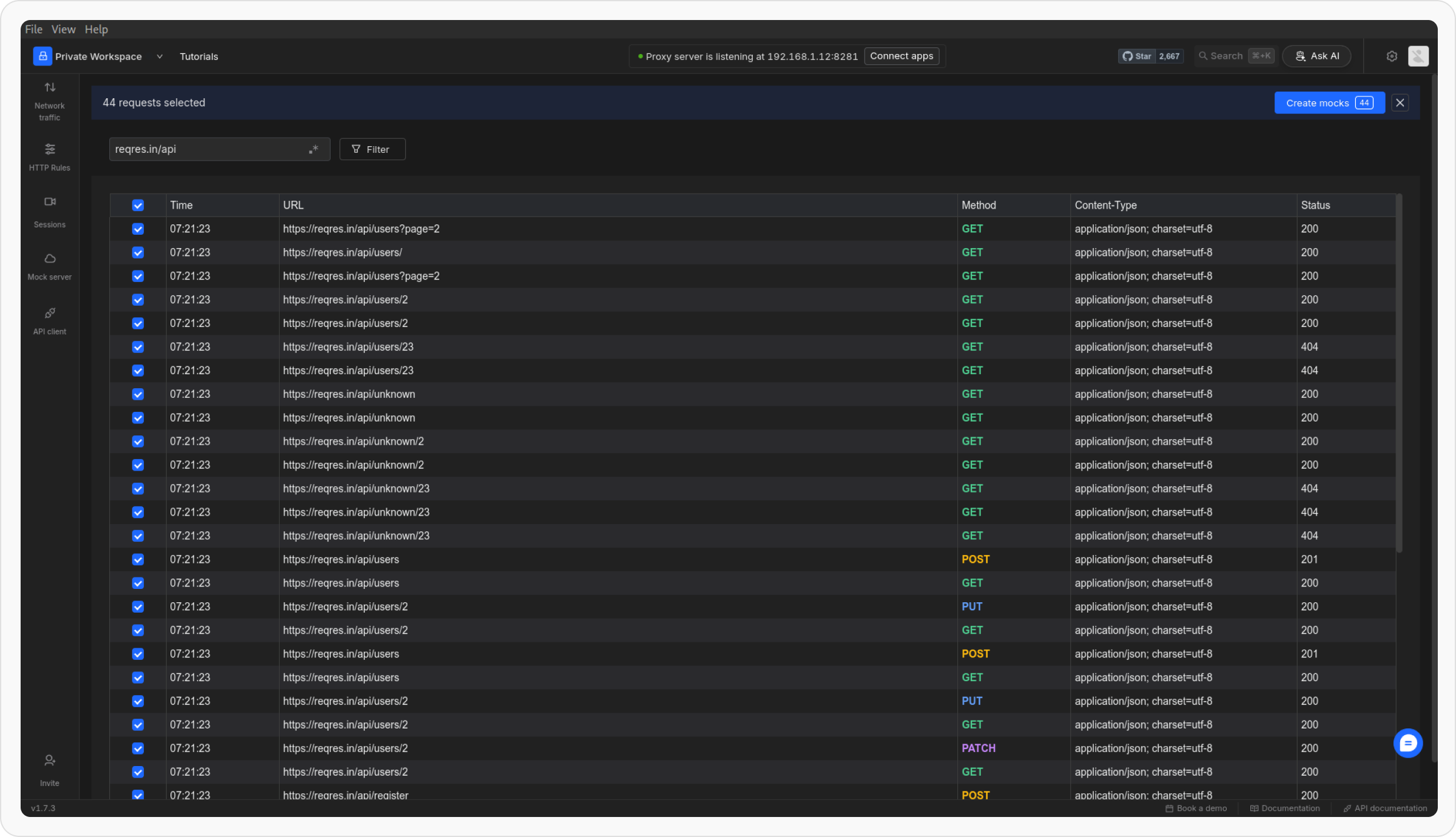 In the traffic table, choose the responses you want to create mocks for. You can select individual requests or multiple requests as needed.