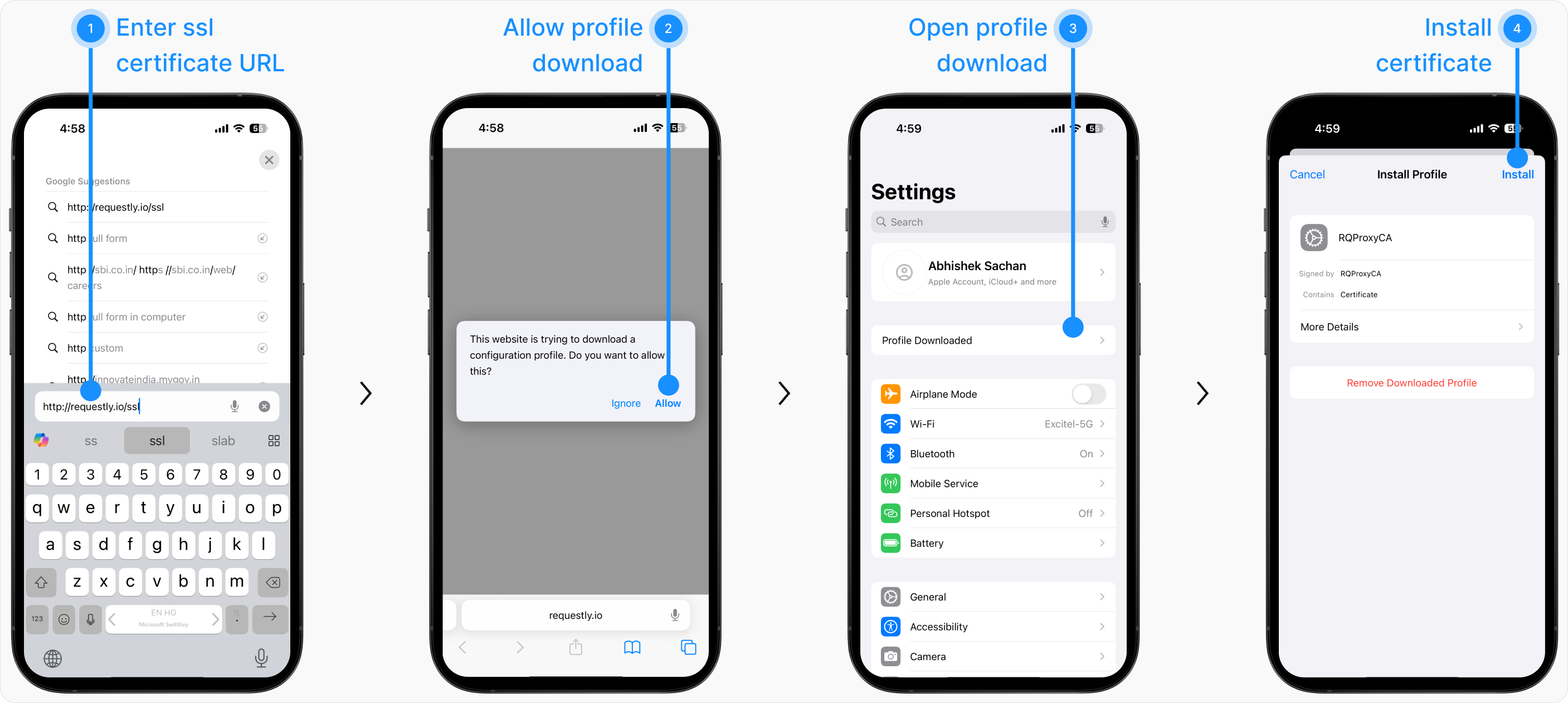 Now open Safari on your IOS device and go to http://requestly.io/ssl(remember to use HTTP, not HTTPS). This should download a custom profile on your device which contains the Requestly CA certificate.
