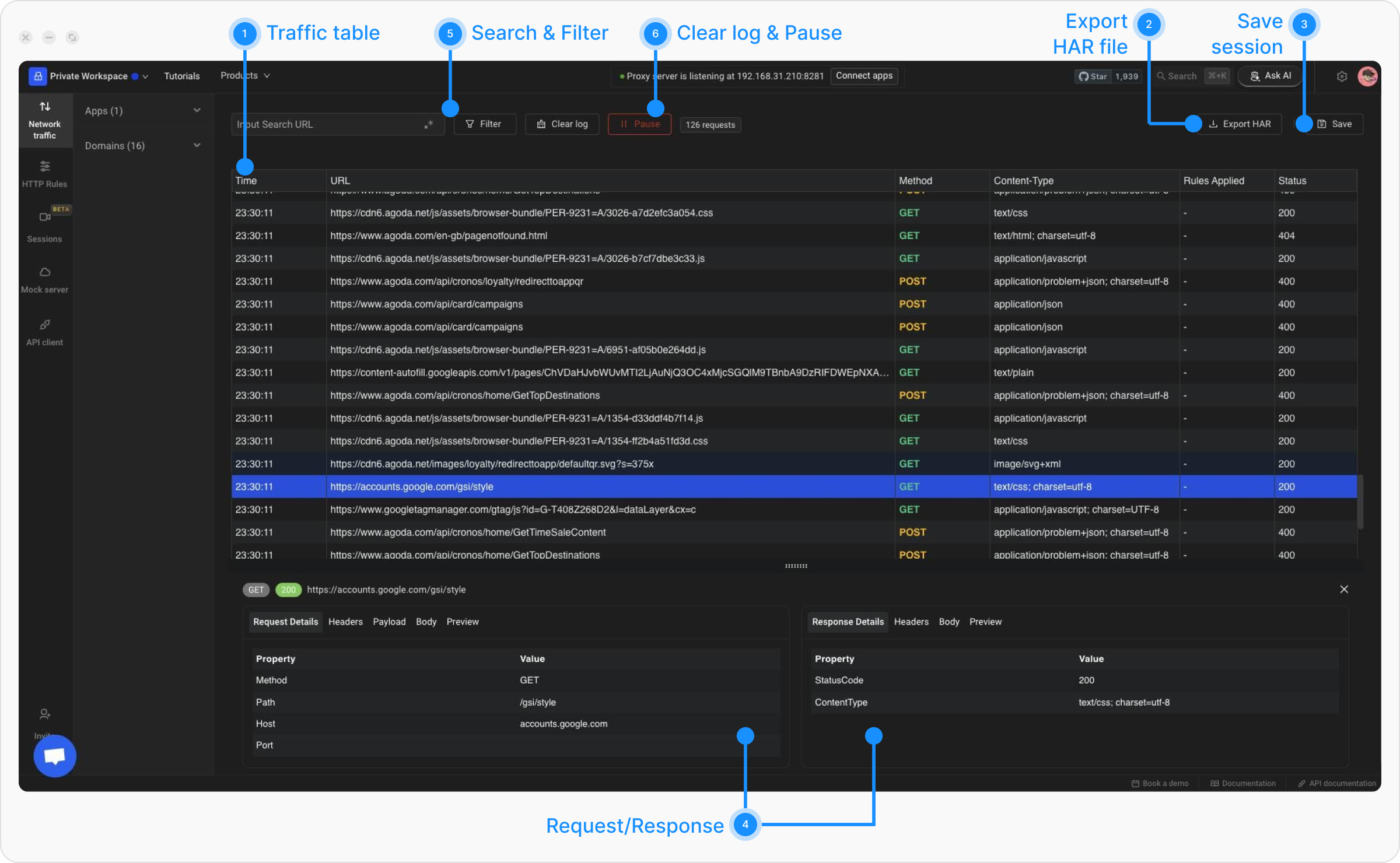 - Traffic Table - Displays all intercepted requests and responses with key details like URL, status, and time.
