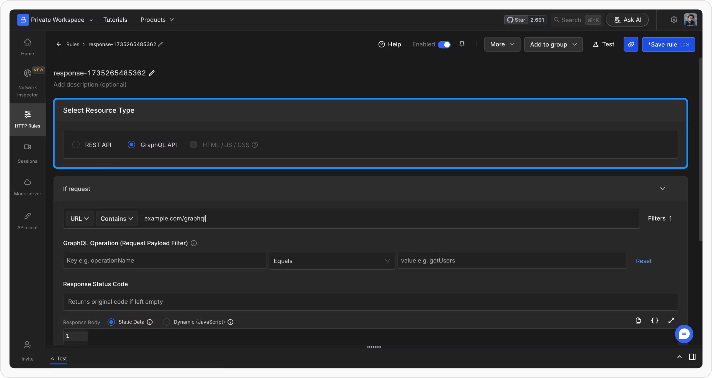 operationName, select Resource Type as “REST API” and use Dynamic (JavaScript) Mode to filter and modify the response.