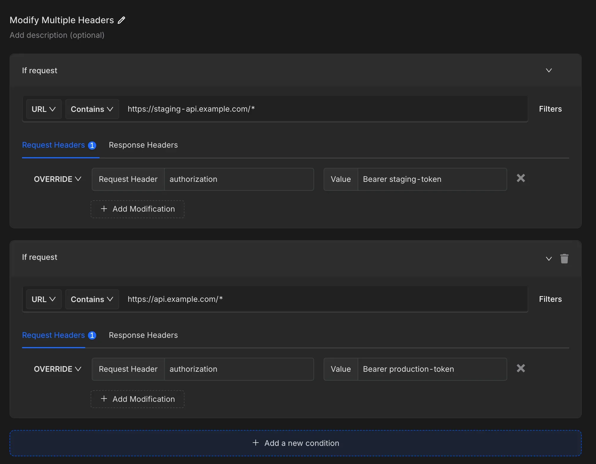 - Each condition is evaluated independently, meaning multiple replacements can be applied to the same request.