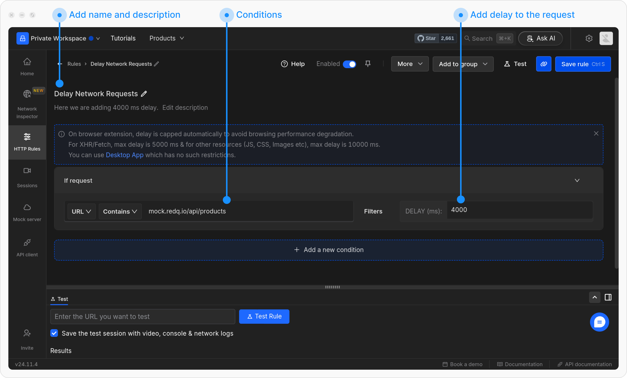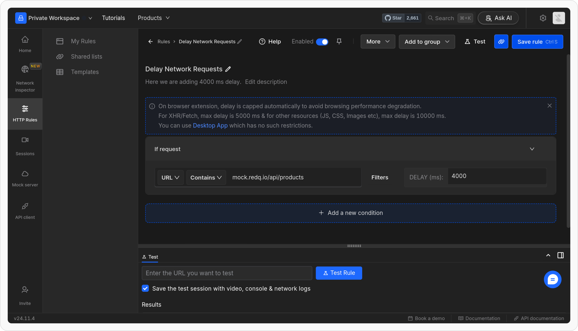 Delay Capping — In the browser extension, delays are capped to prevent performance issues. The maximum delay is 5000 ms for XHR/Fetch requests and 10000 ms for other resources (JS, CSS, images, etc.). The Desktop App has no such restrictions.