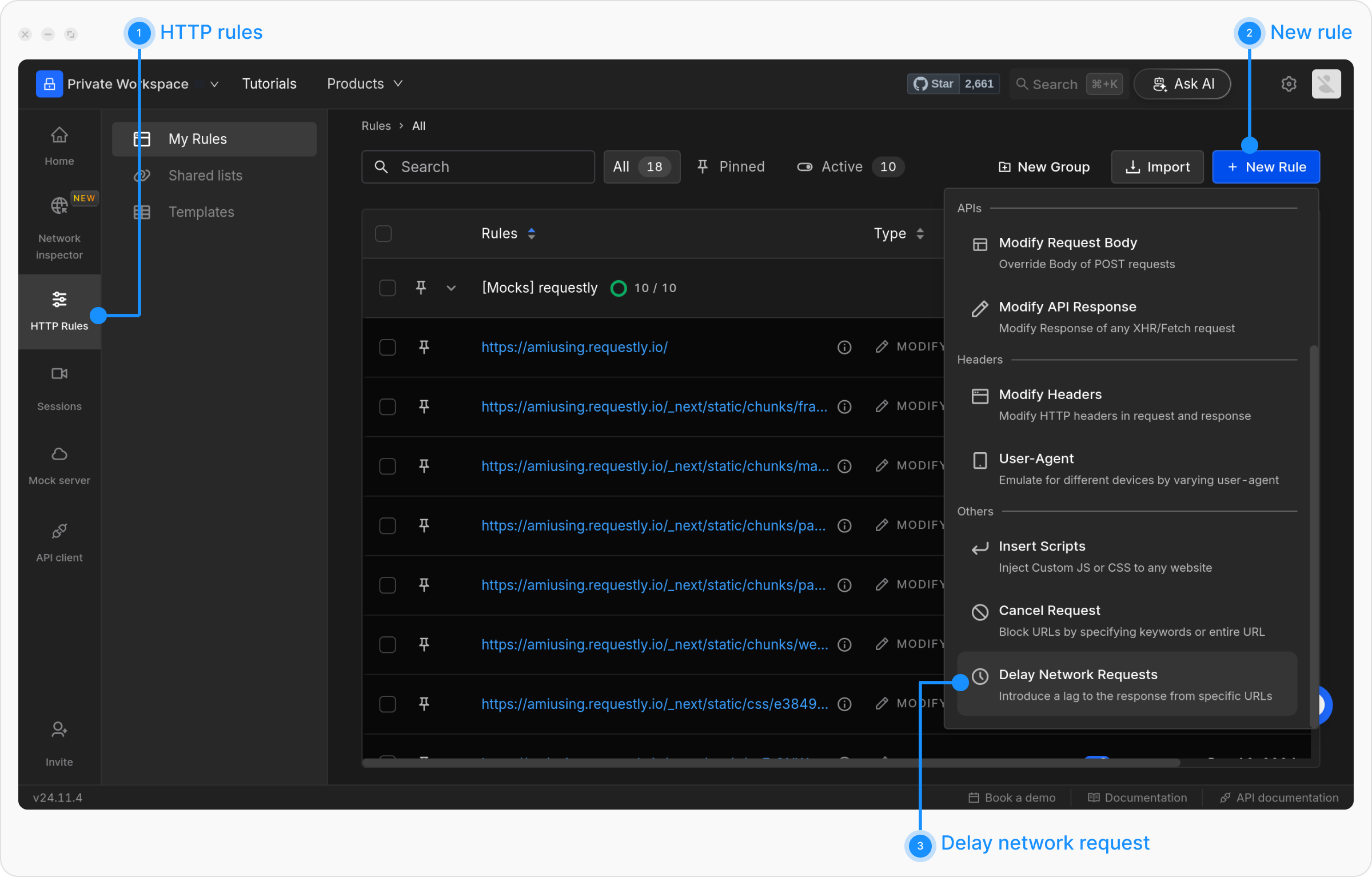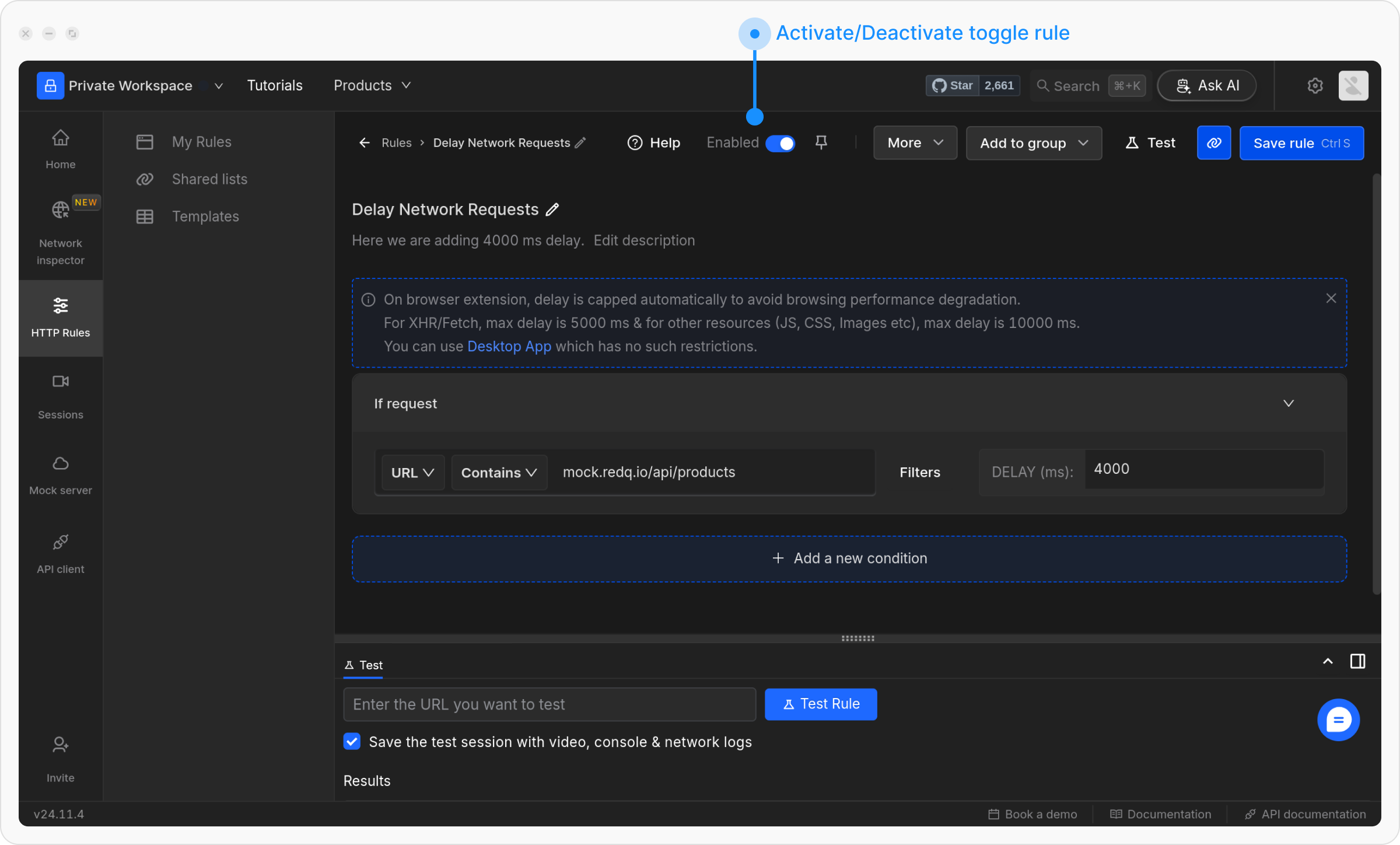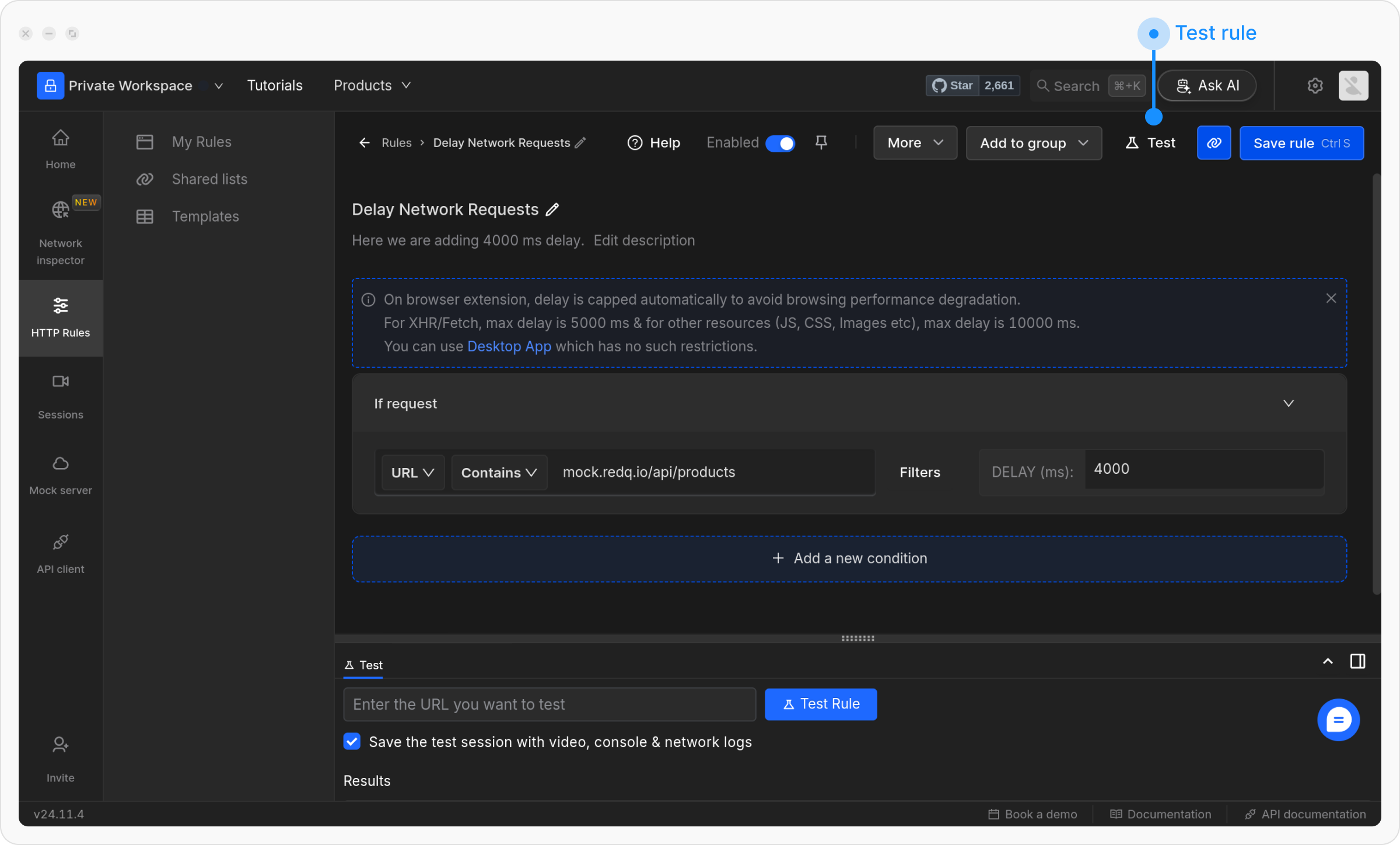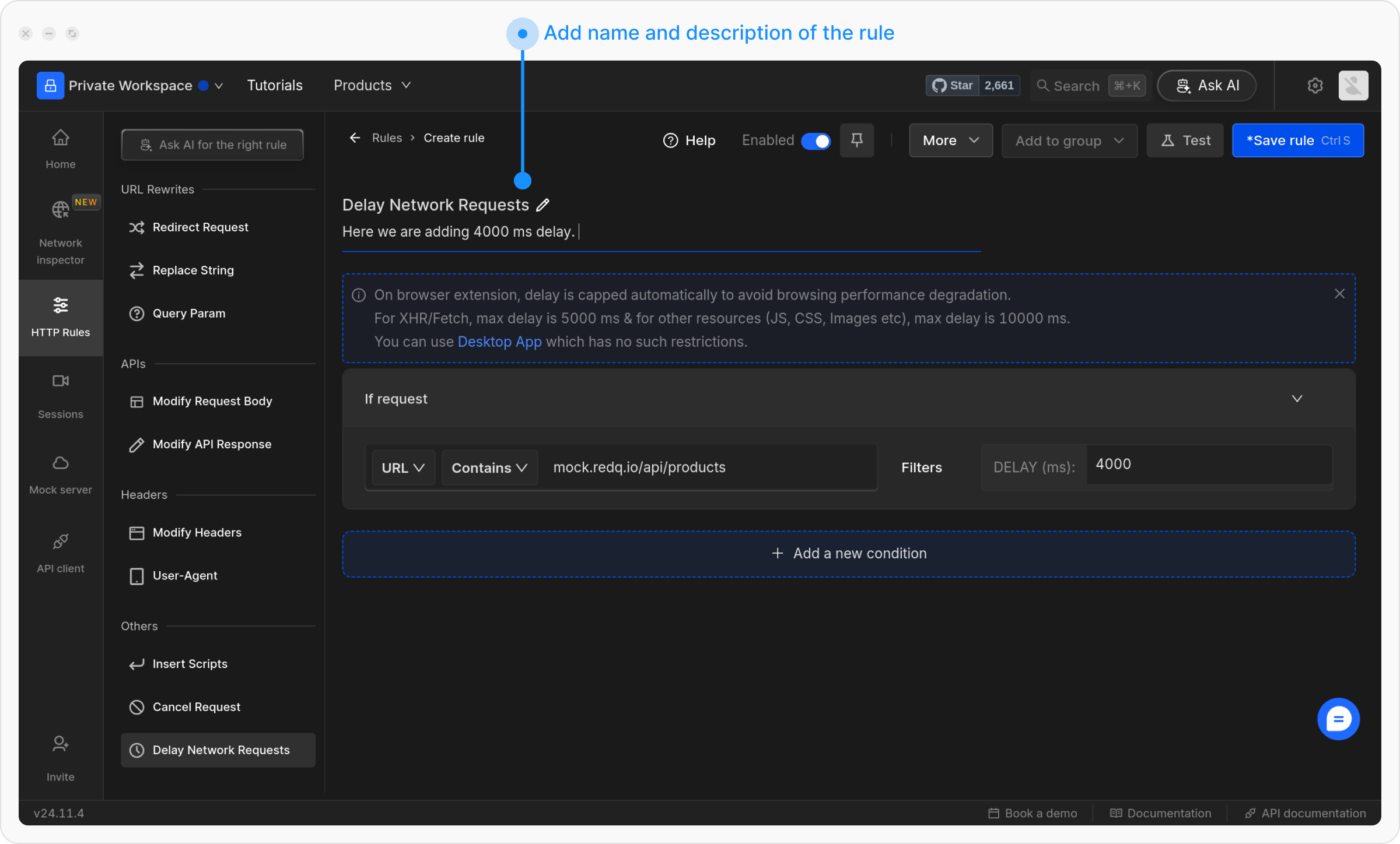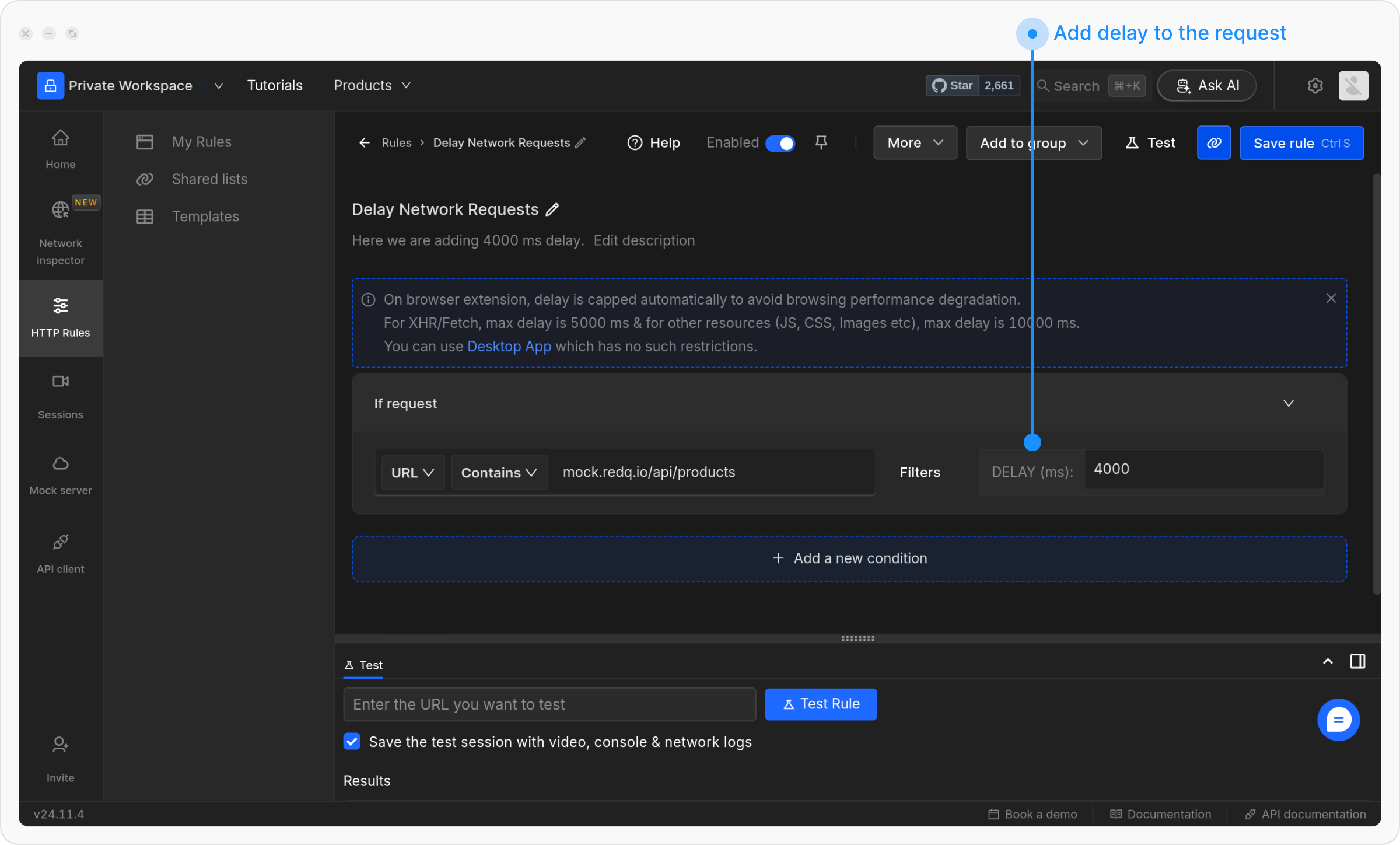 Navigate to the HTTP Rules tab in the web or desktop app. Click on + New Rule and select Delay Network Requests from the options.