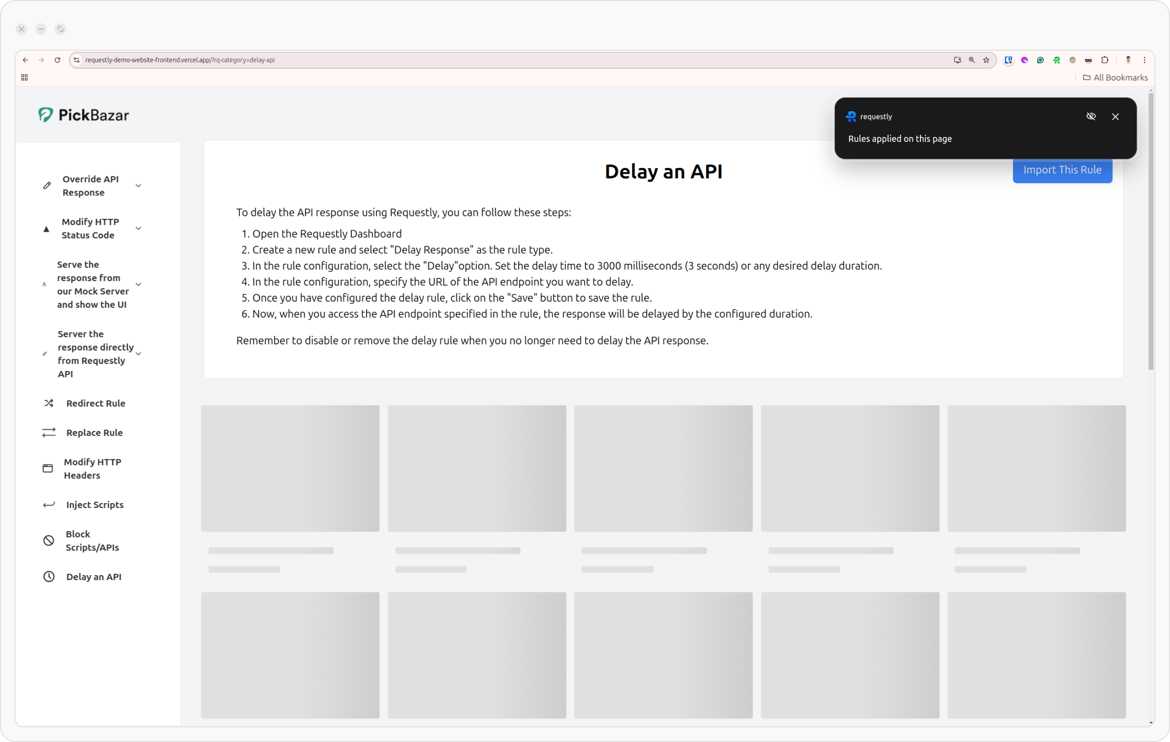 This example targets the product data API of our playground website, https://www.requestly-playground.com/.