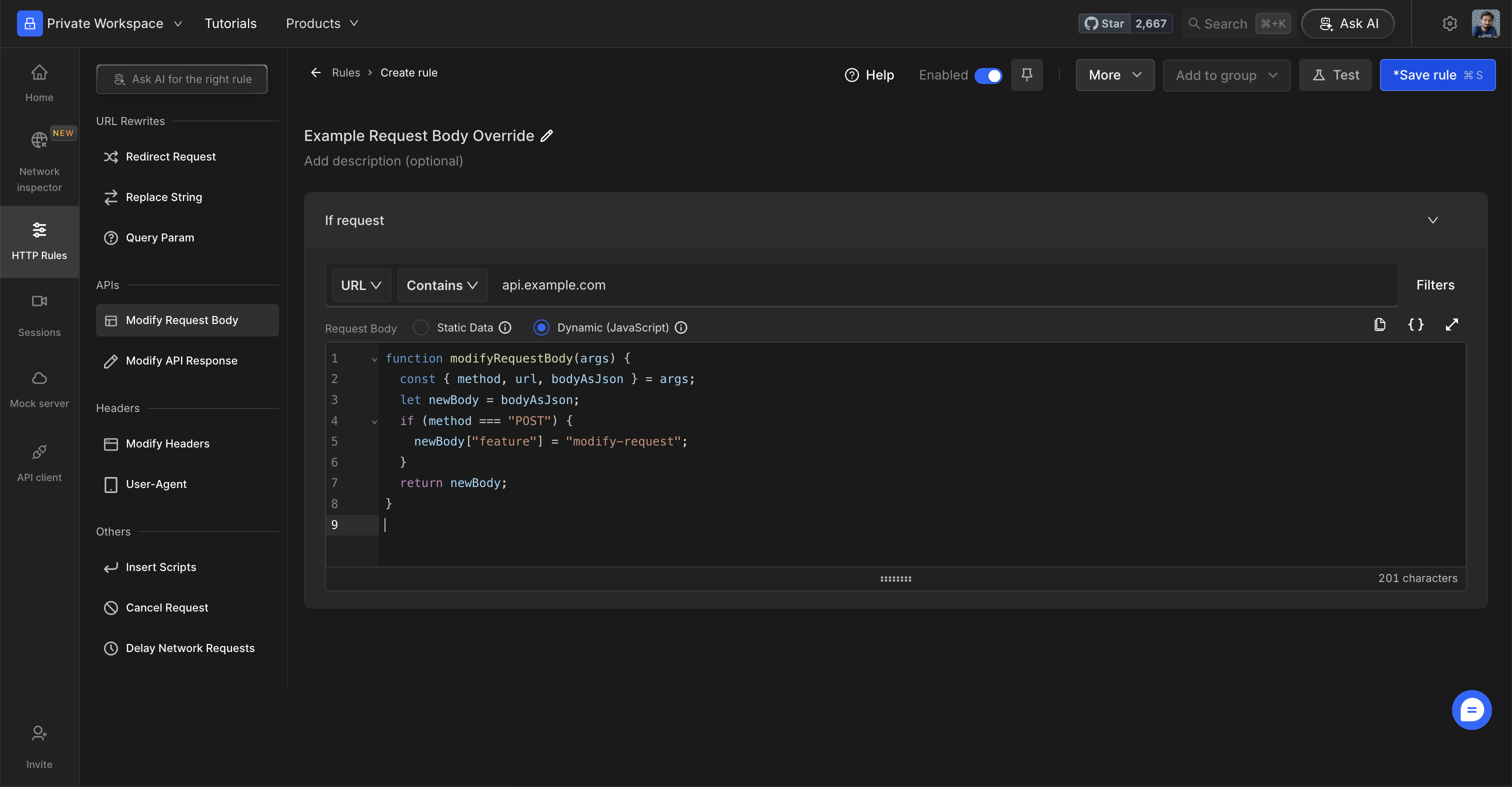 - Programmatic Request Body Modification: Dynamically modify the request payload using JavaScript based on specific conditions.