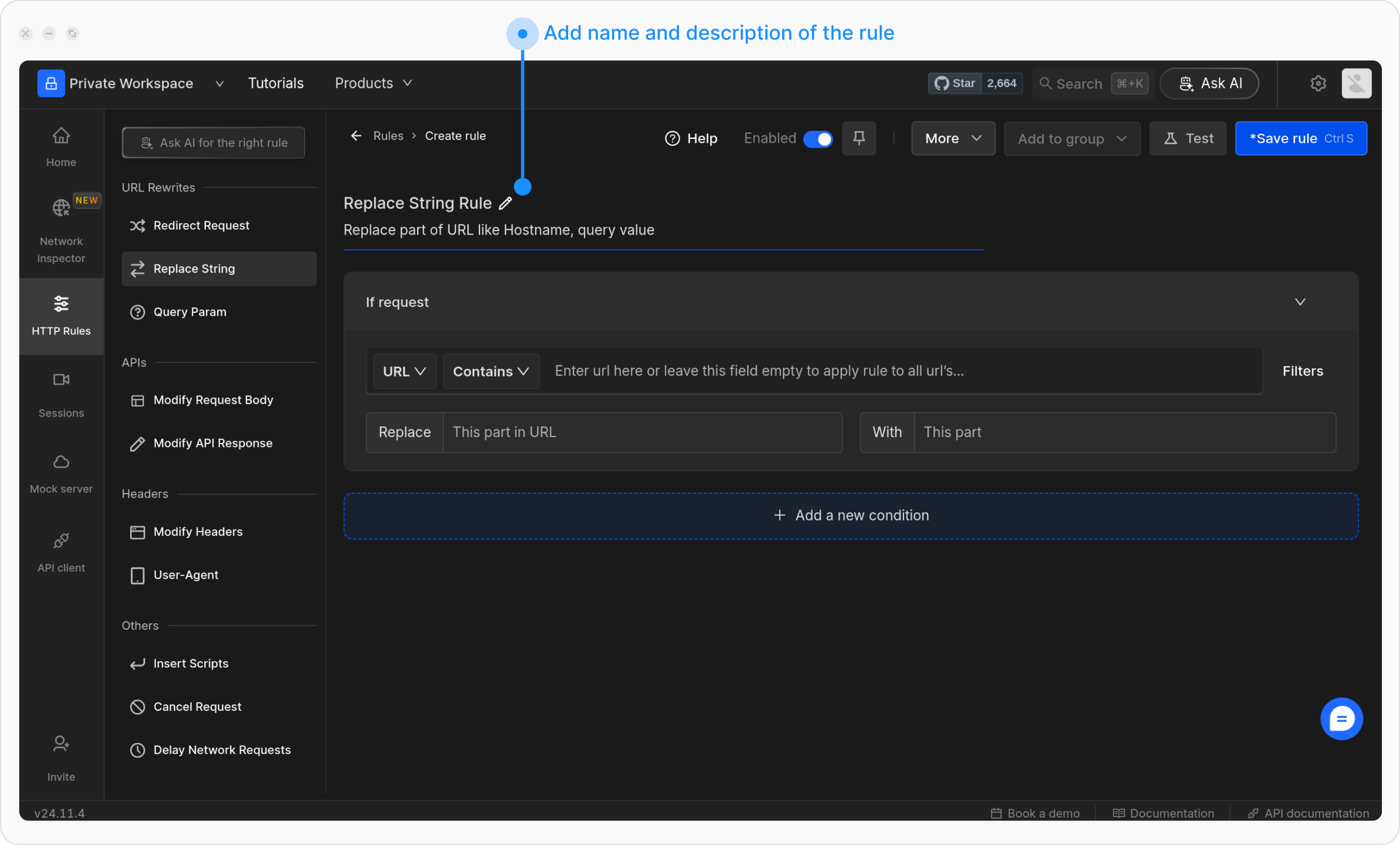 The Replace String Rule in Requestly allows you to modify the content of HTTP requests and responses, making it easy to test, debug, or apply fixes dynamically without modifying your original codebase. This feature is useful for replacing URLs, headers, or specific content in requests and responses.