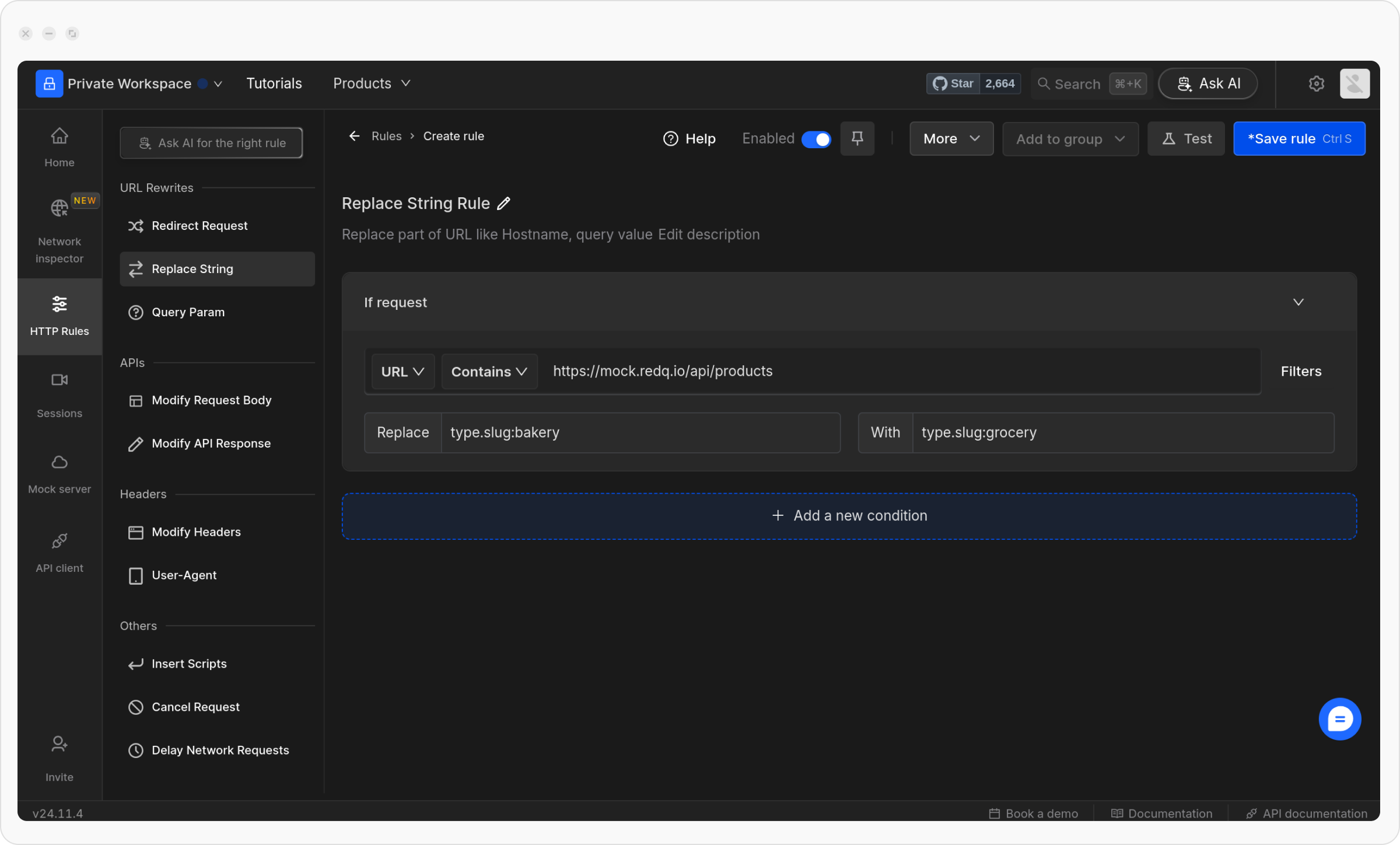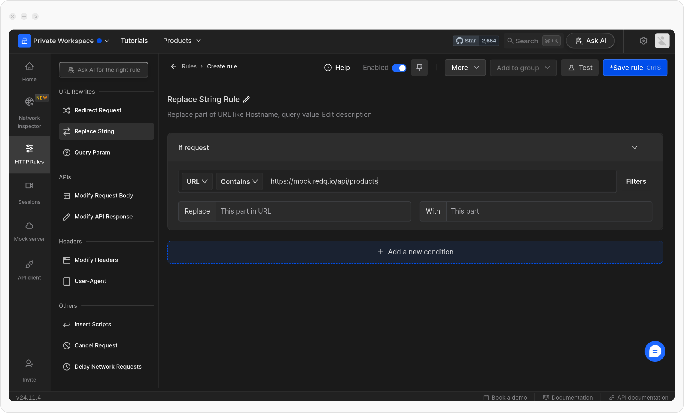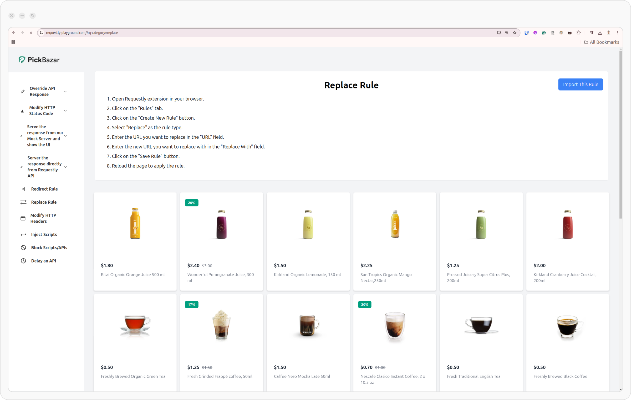Replace Request rule. This gives you a near-live experience of how the rule works. In this case, we are targeting API requests that fetch product data.To replace the API endpoint to fetch products- Condition Type: URL