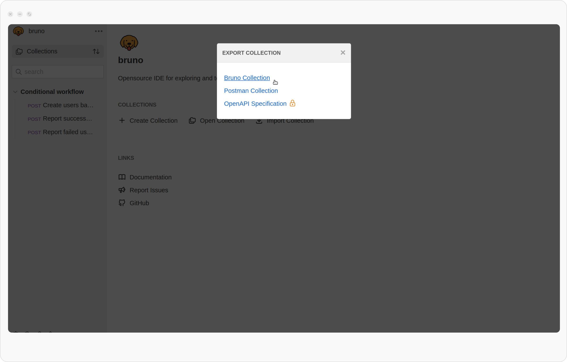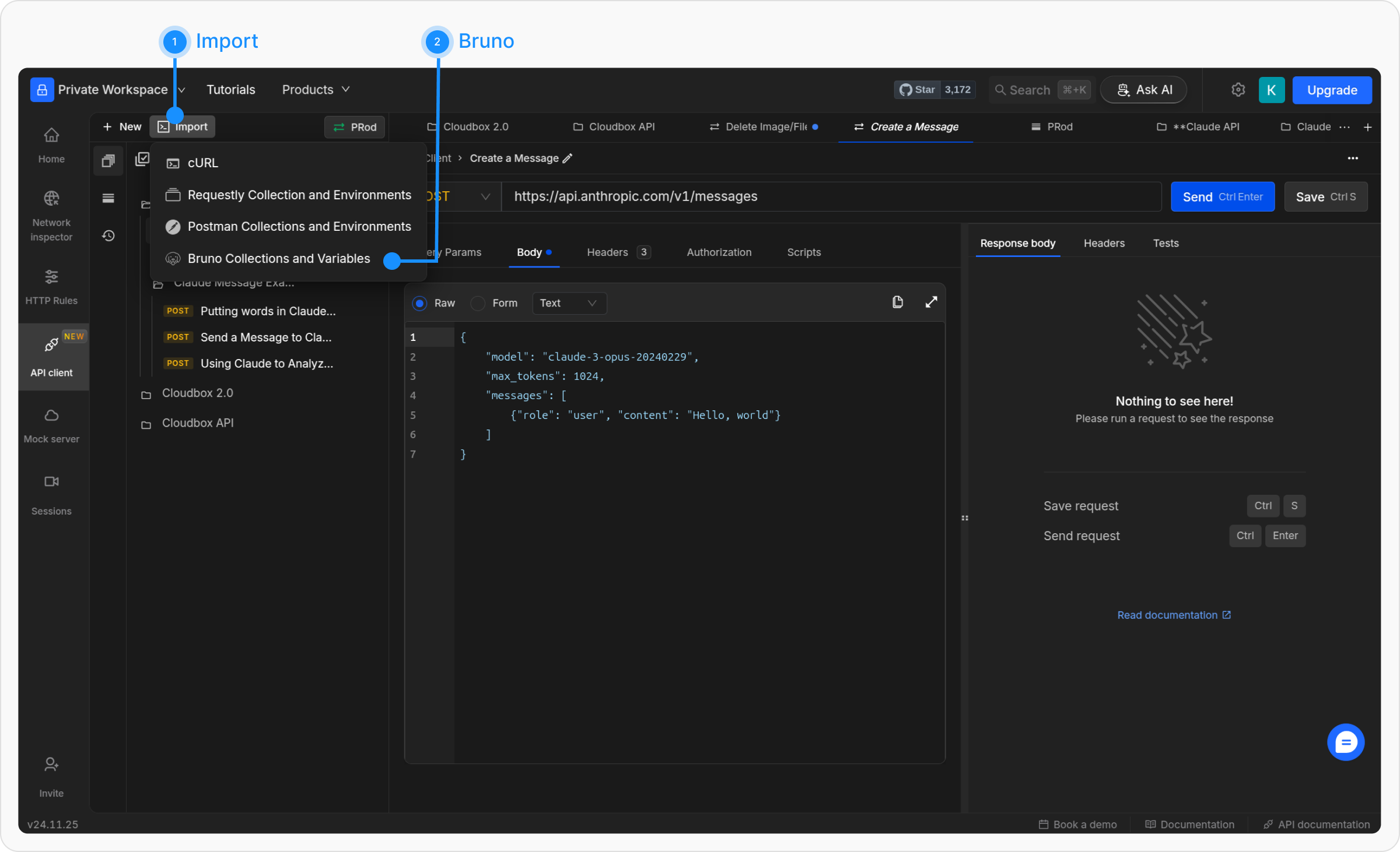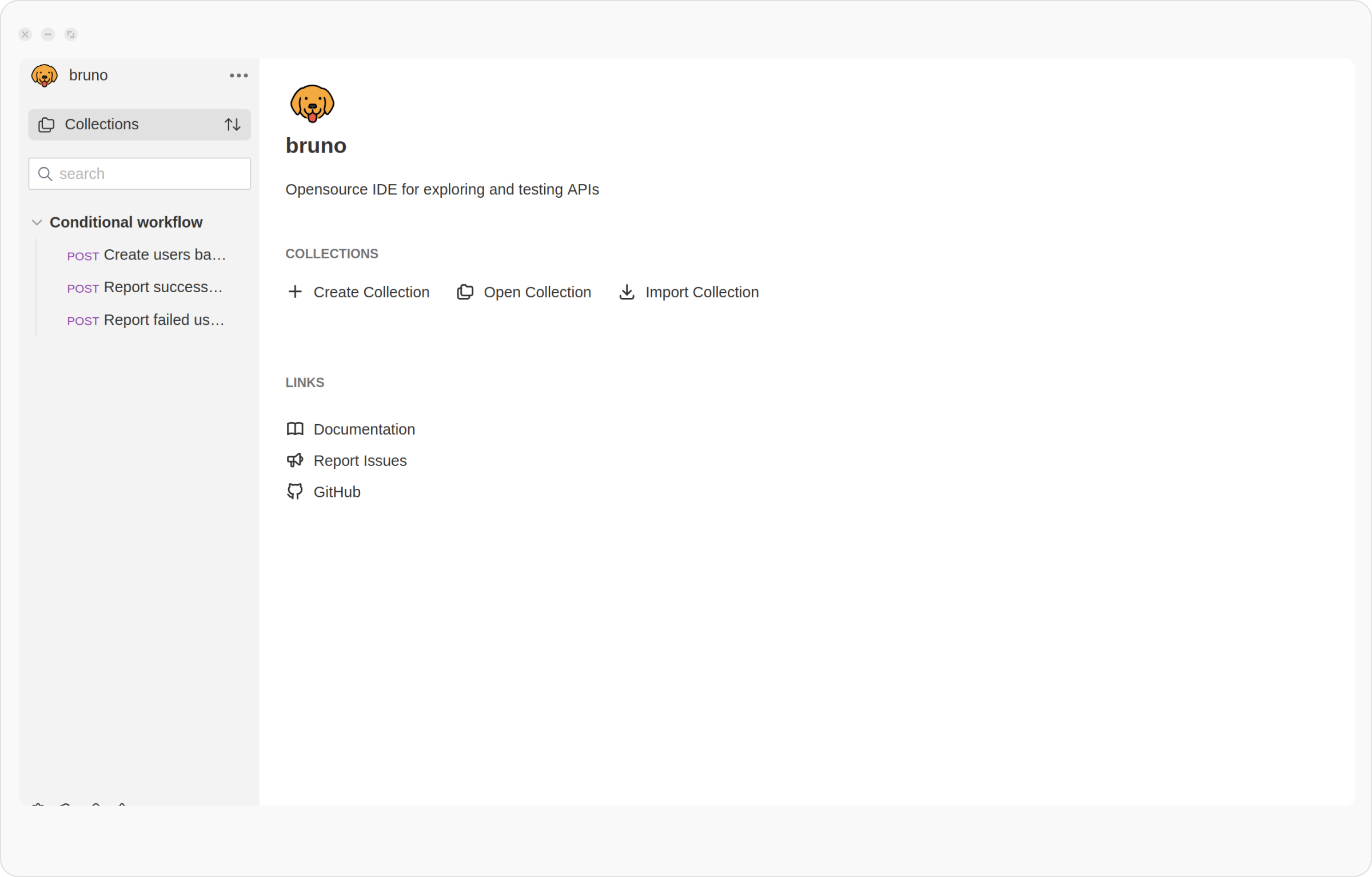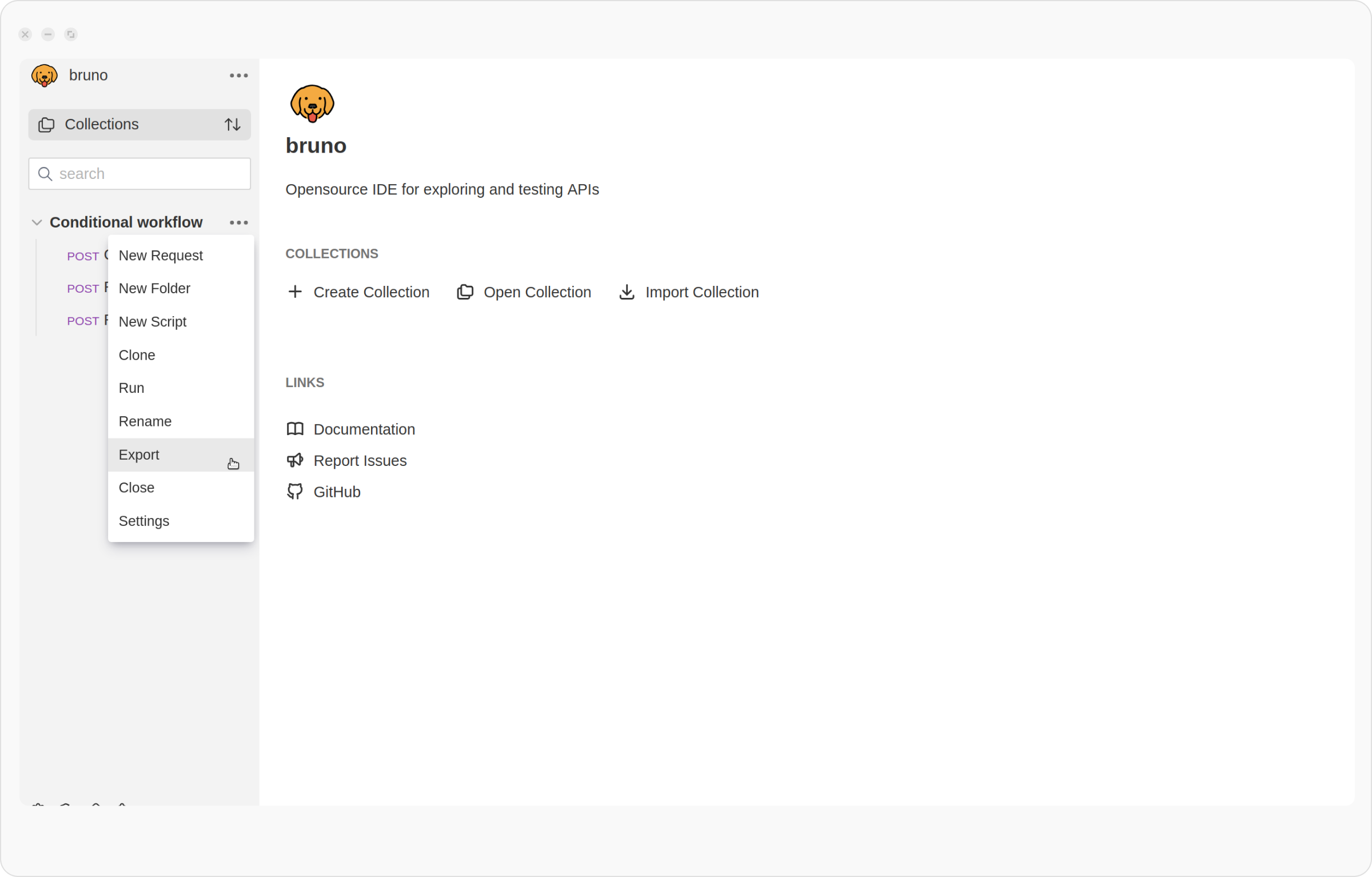 Click the Import button in the sidebar header and choose Bruno from the import options.