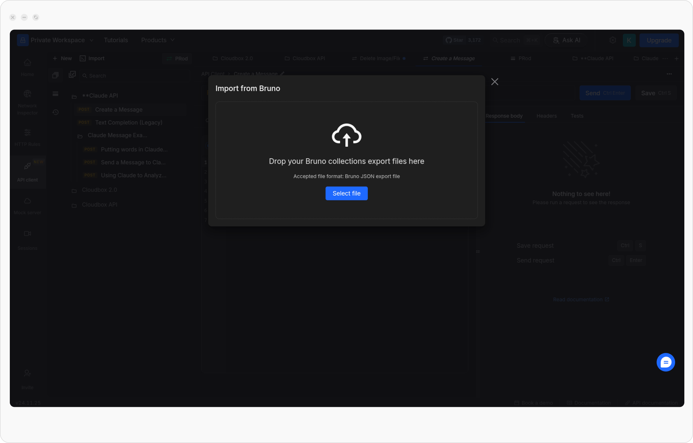 In the upload modal, select and upload each exported Bruno collection or environment file individually.