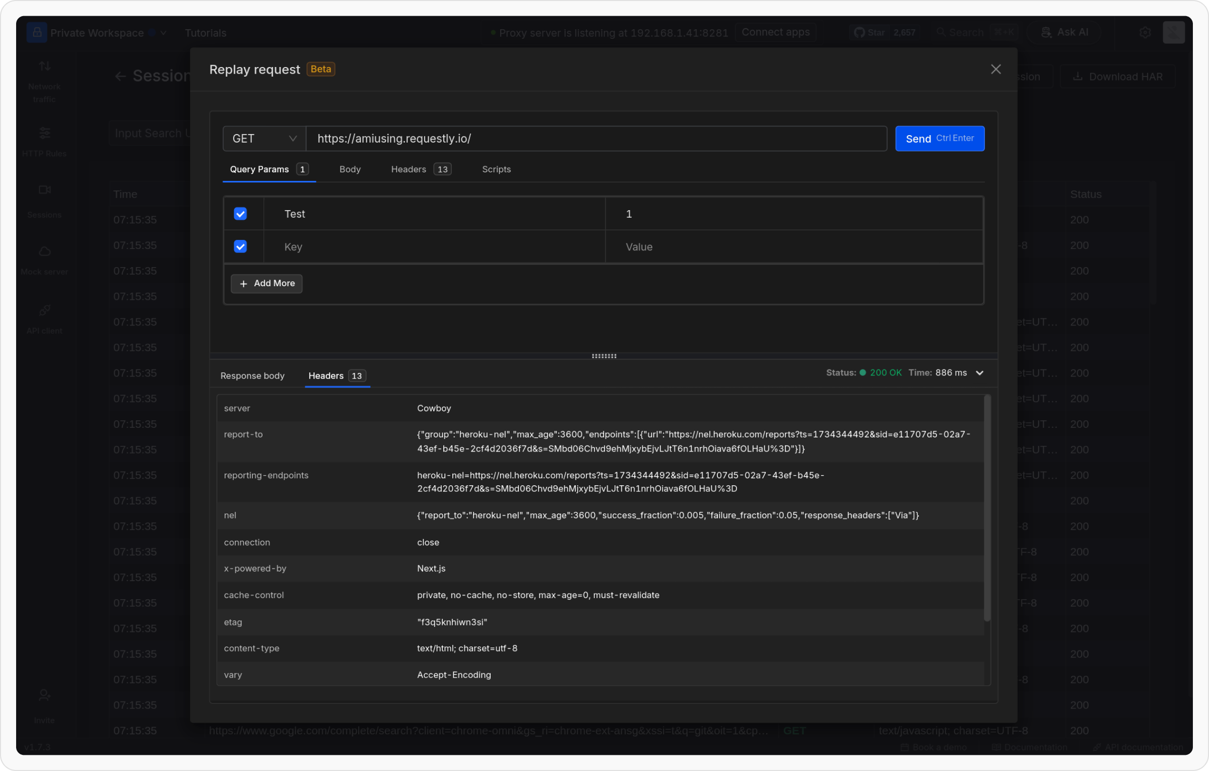 The Edit and Replay feature lets you send API requests to an endpoint and modify various parameters like headers, body, query parameters, and more. This functionality acts as an integrated API client within your sessions, making it easier to test and modify API requests directly.
